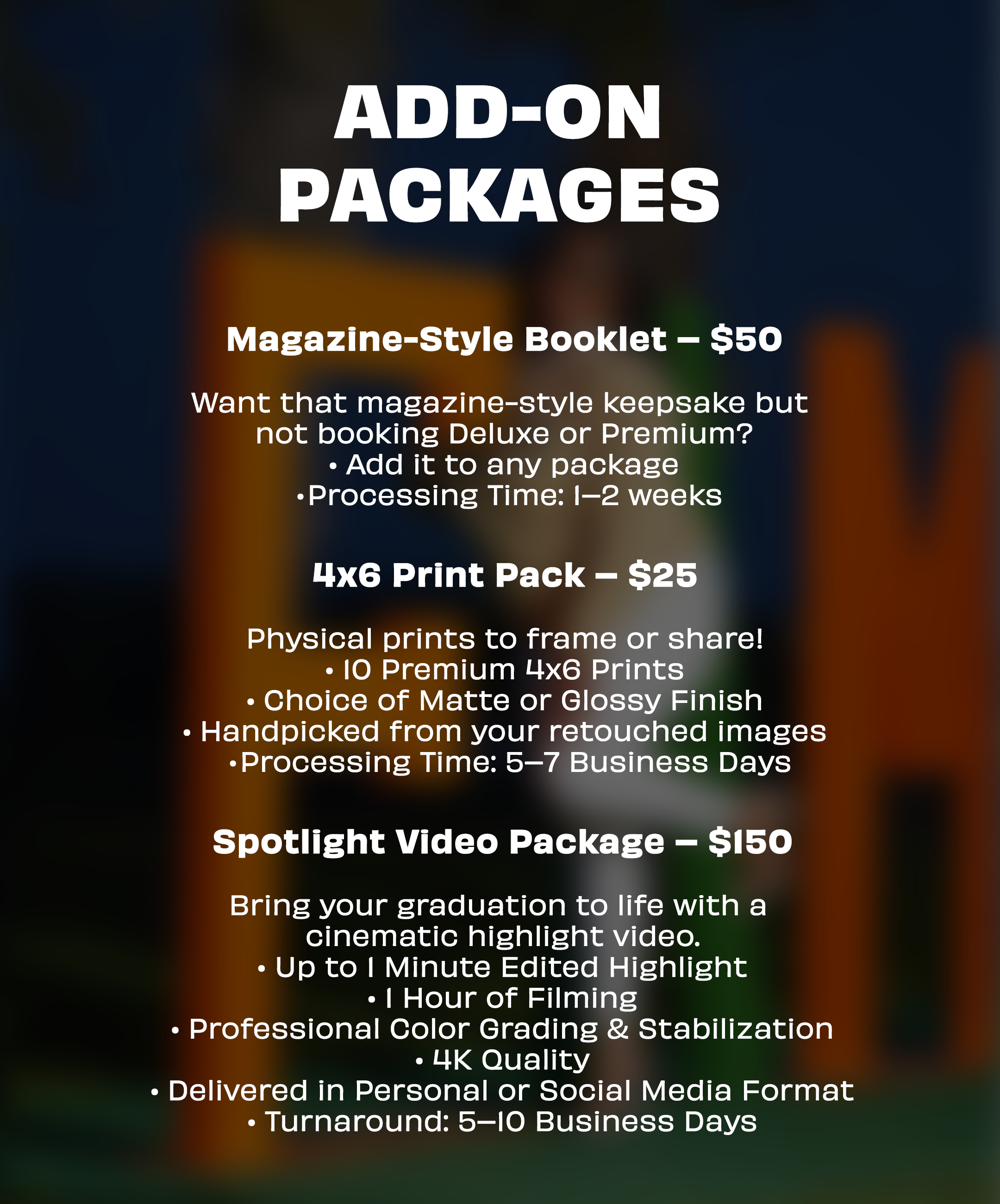 Quick Graduation Package $150.00 Standard Graduation Package $250.00 Deluxe Graduation Package $375.00 Premium Graduation Package $525.00 Go Best Friend Package $500.00 Quick Studio Graduation Package $150.00 Standard Studio Graduation Package $200.00 4x6 Print Pack $25.00 Magazine Package $50.00 Favorite Fella's Package $60.00 Behind The Scenes B-Roll $175.00 Quick Outdoor Session $65.00 Birthday Studio Package $175.00 Lifestyle Package $150.00 Professional Headshot $35.00
